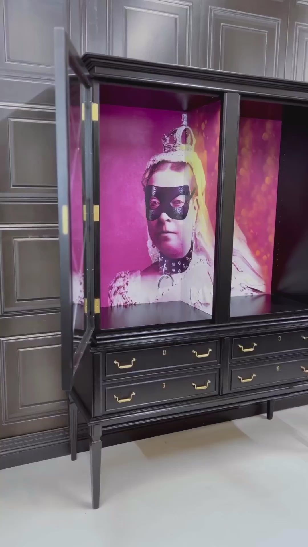 This large vintage display drinks cabinet was painted in a deep black and a bespoke Queen Victoria print was applied inside and beautifully lacquered to protect the unit.