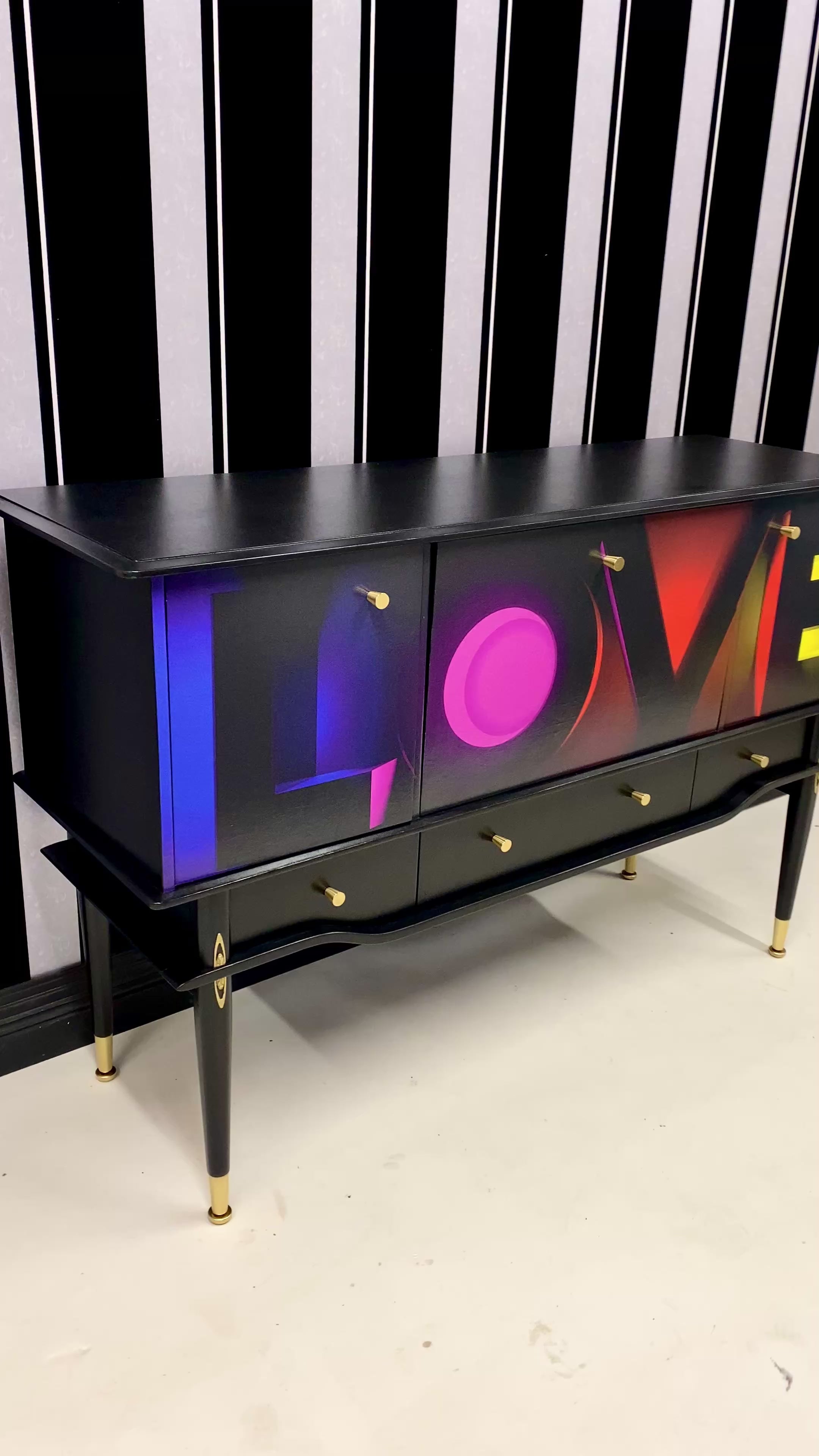 A cool upcycled vintage sideboard with a glowing LOVE design on the front. It's a perfect painted TV unit to bring some amazing colours and disco vibes into the room..